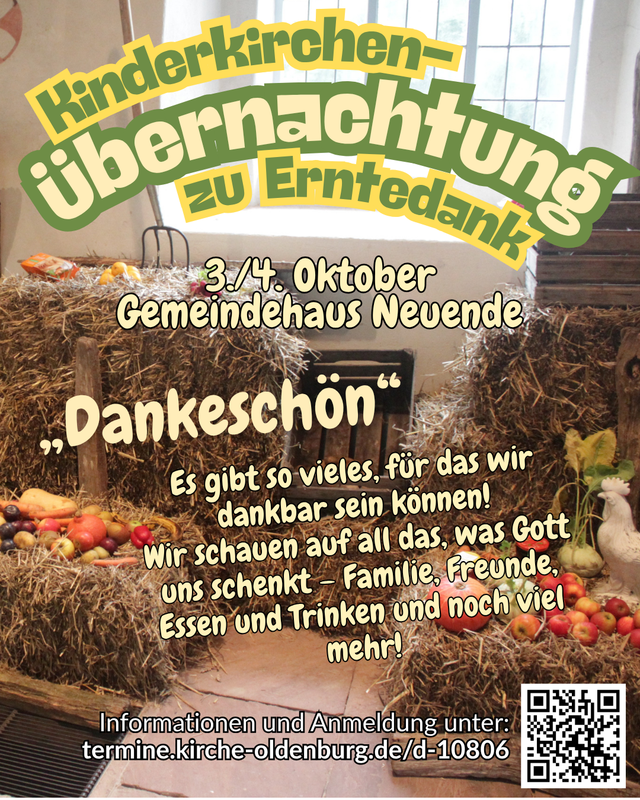 In diesem Jahr feiern wir Erntedank auf ganz besondere Weise! Alle Kinder ab fünf Jahren sind herzlich eingeladen, mit uns zu einer Übernachtung in der Kinderkirche zu kommen. Wir starten 3. Oktober um 16 Uhr und verbringen eine schöne „klassische Kinderkirche“ zum Thema Erntedank – mit singen, bastel und vielen Spielen. Mit einem gemeinsamen Abendessen beenden wir den Tag.